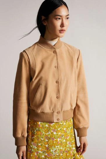 Ted Baker Benia Brown Cropped Suede Deep Rib Bomber Jacket