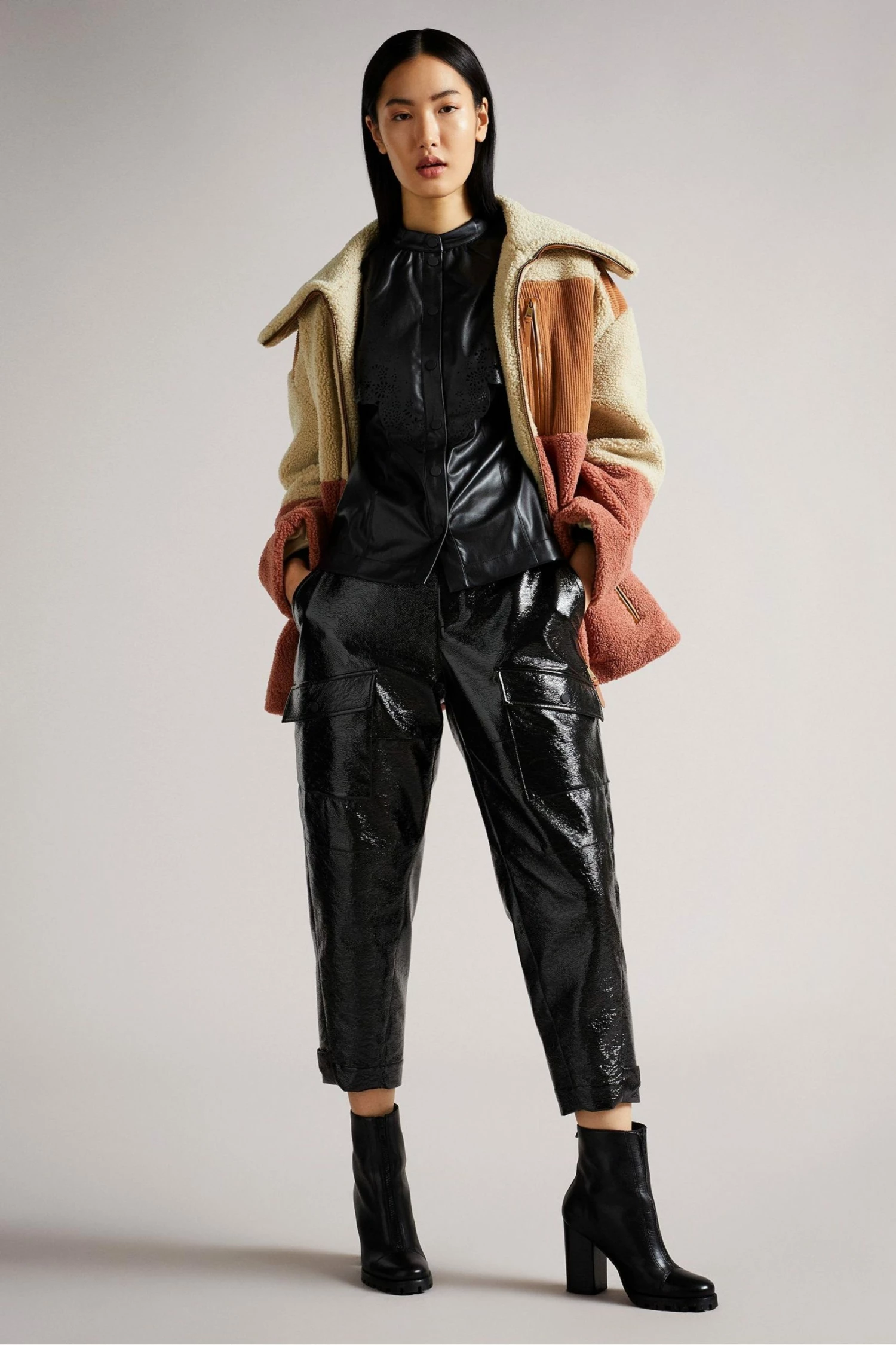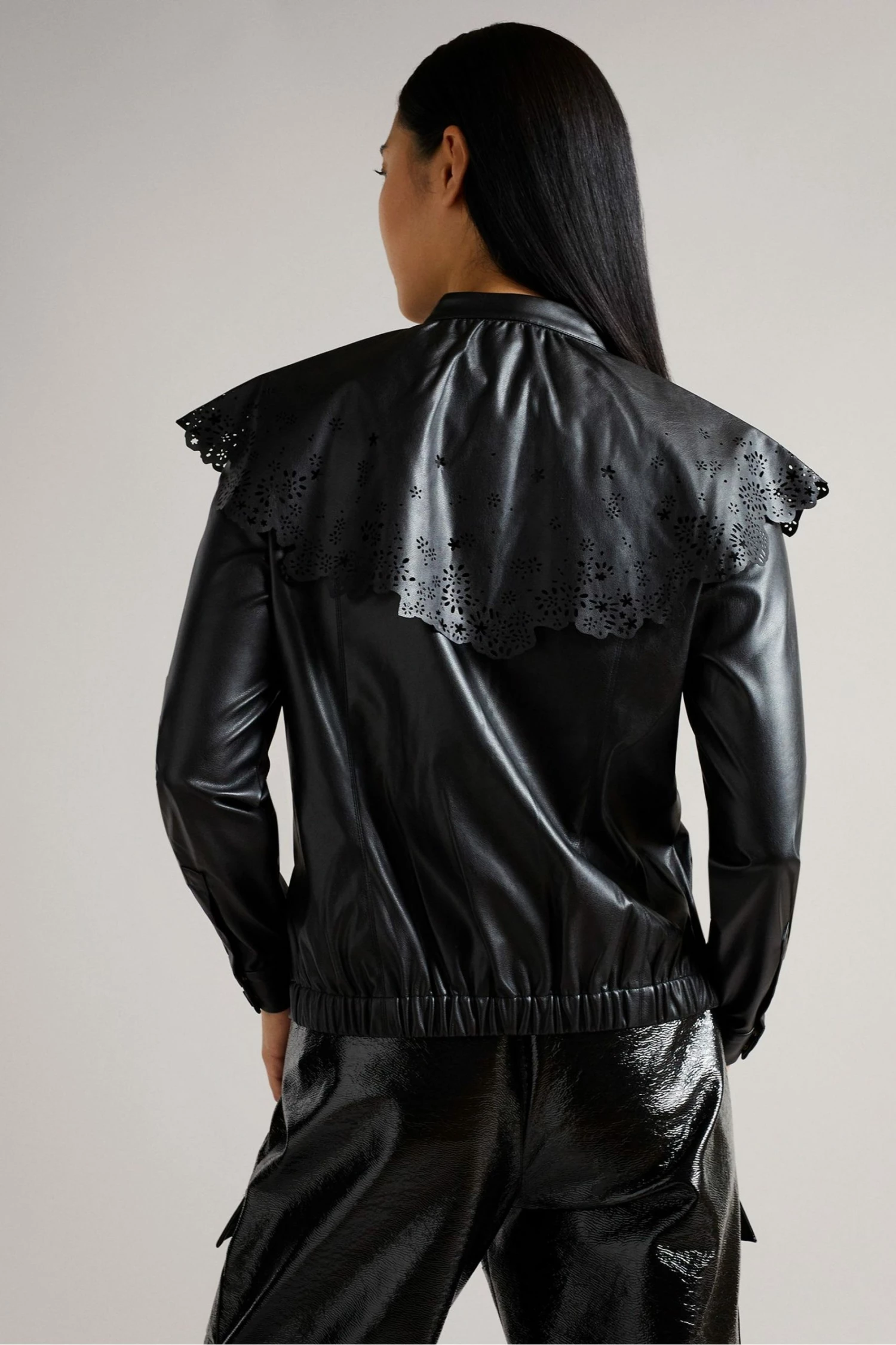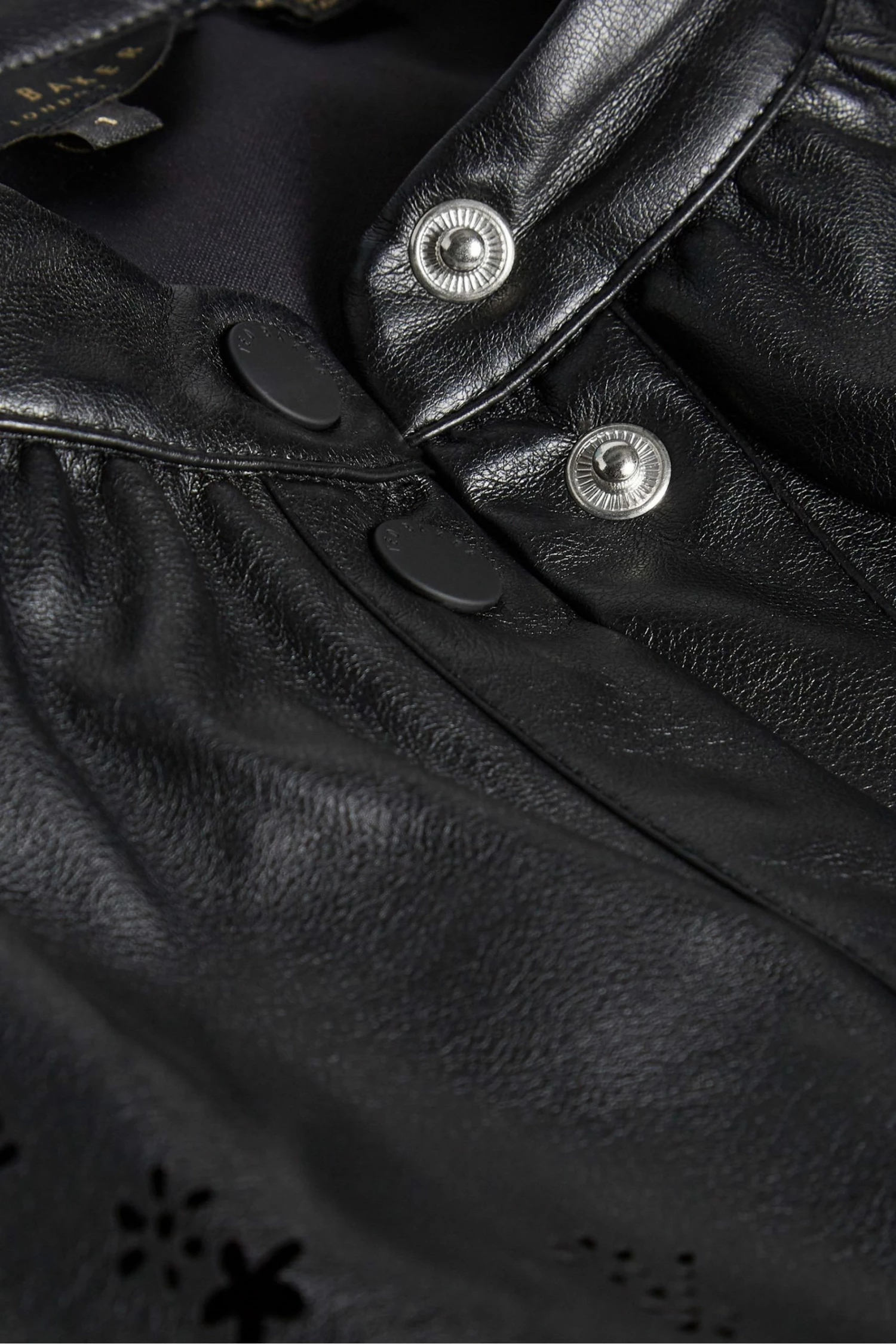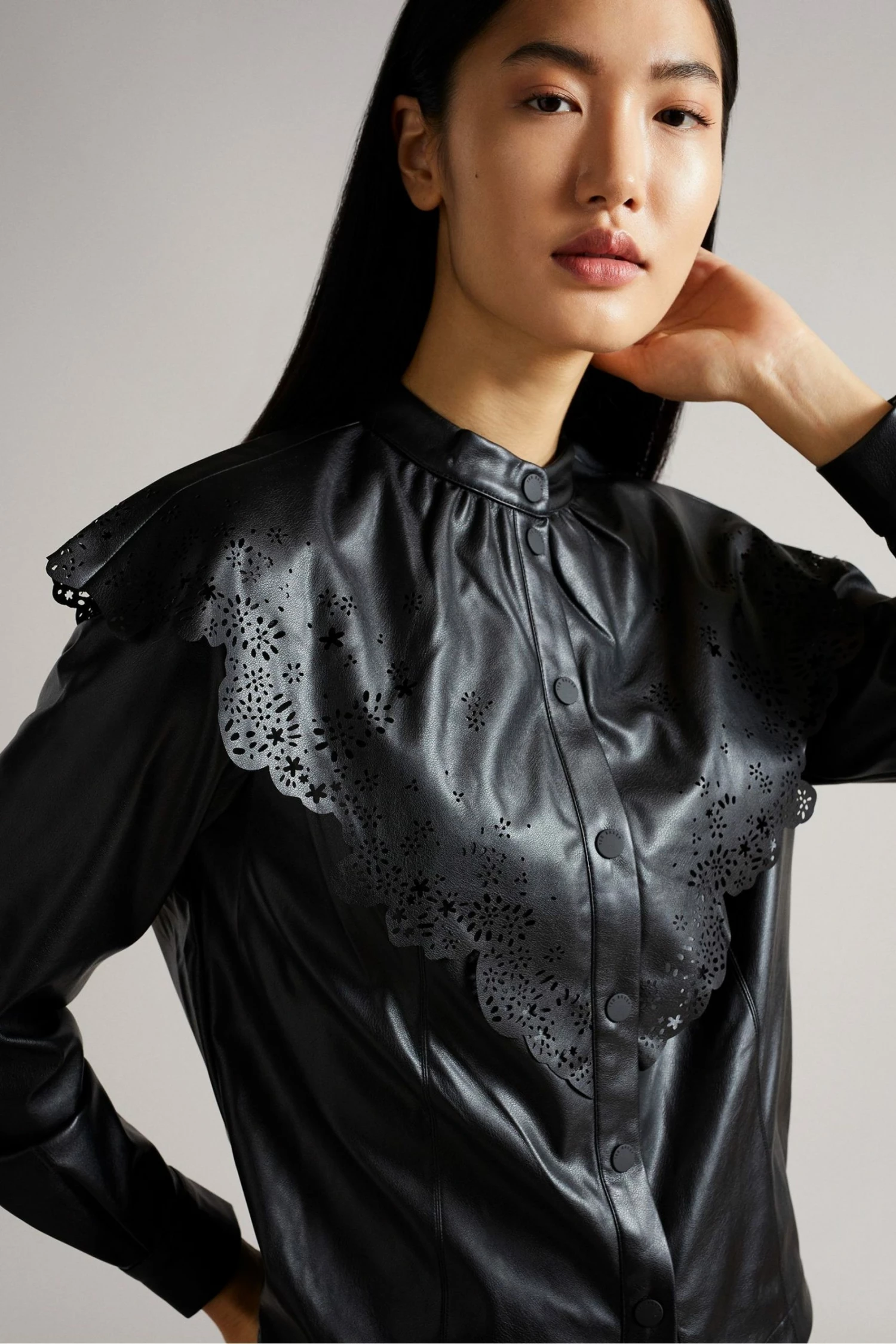 MAISSON it s why the lady is a vamp. Bringing a twist to classic English lace, this pleather top is certain to add a statement to your wardrobe. A button-up t-shirt design, the leather biker look contrasts with the perforated lace-style design of the collar to provide an elegant softness with edge. Pair with pleather trousers for a rock star look or tone down with three-quarter jeans.