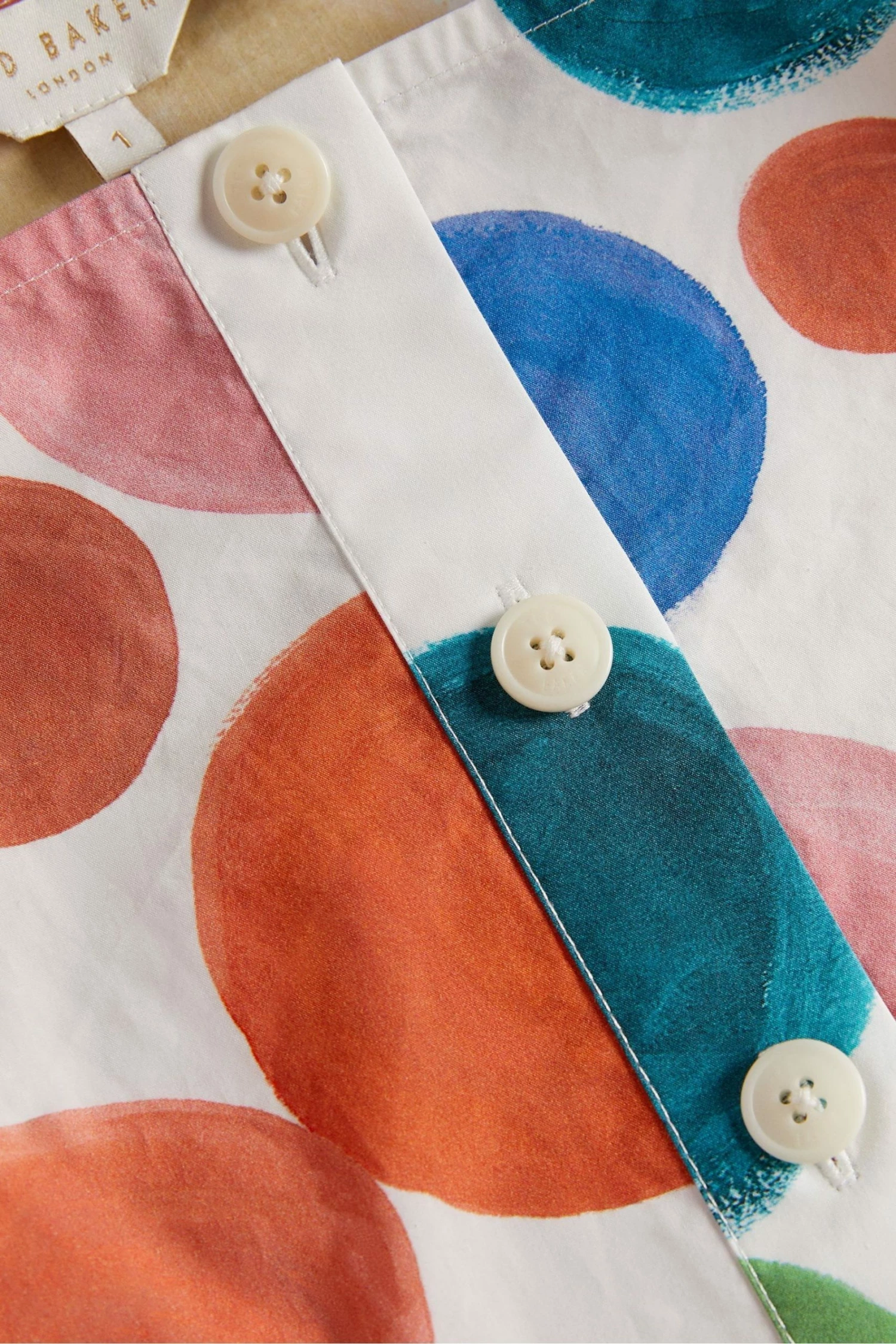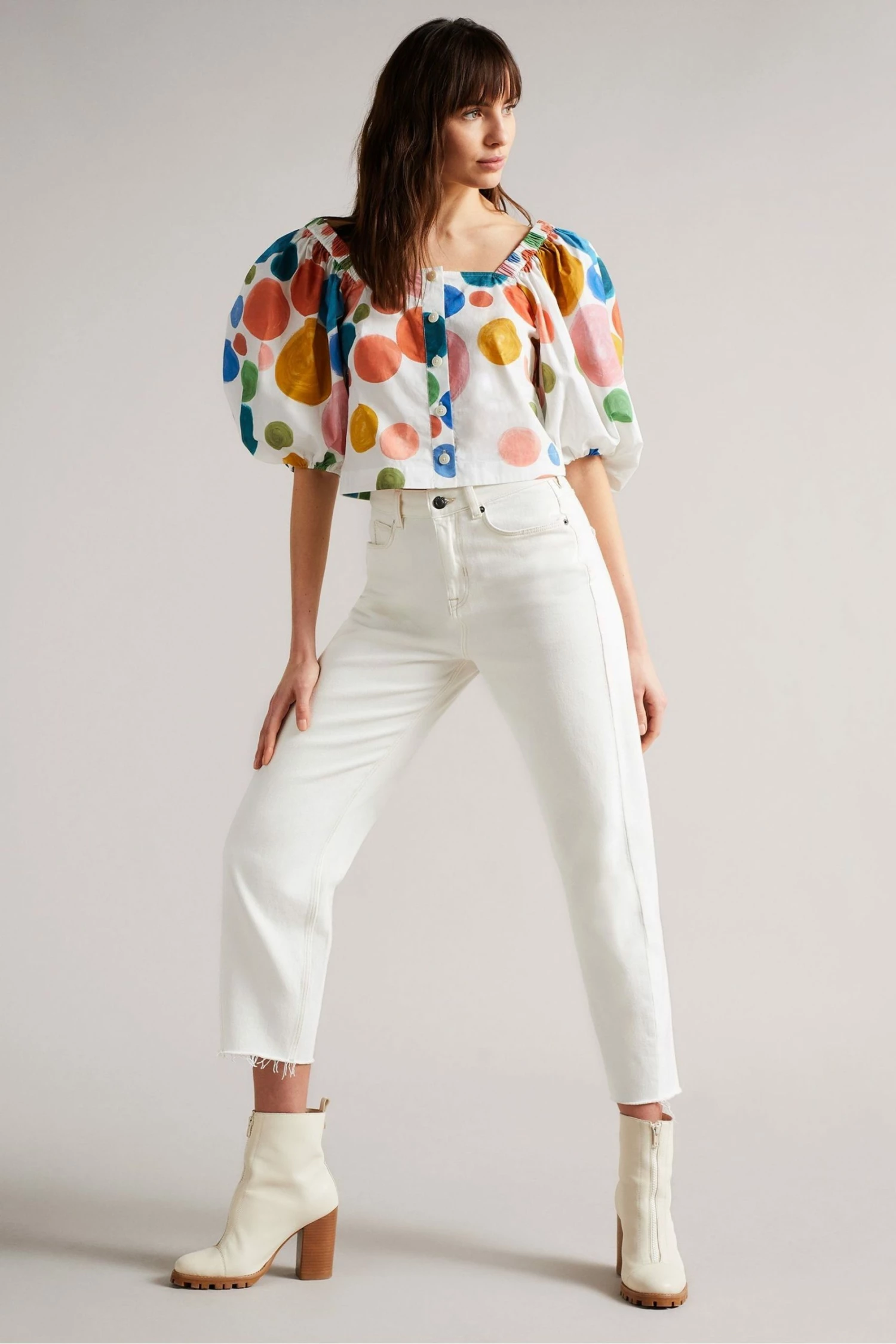 From Ted Baker, this white Nelda top has been designed with bold structured puff sleeves and a cropped silhouette that sits neatly at the waist. The button-up front showcases the square neckline that drops gently over the shoulders. On a white breezy cotton base, this summer-ready blouse has a painterly polka dot print.